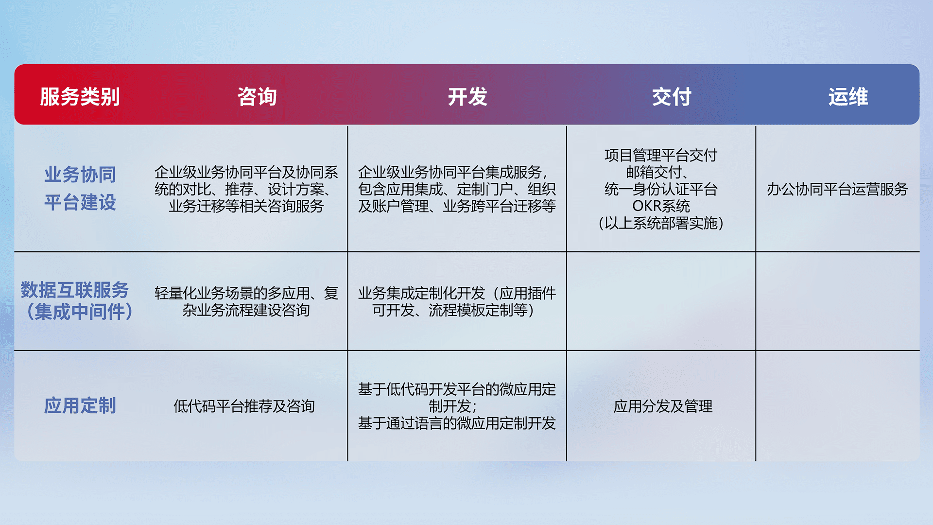 针对钉钉、、、、企微、、、IDaas等平台级产品提供产品的规划、、、、方案、、、、交付、、、、定制化开发等服务,,,实现如统一协同办公、、智能客户服务、、、、混合会议管理、、智能数据查询、、、等业务场景,,实现数字化转型。。